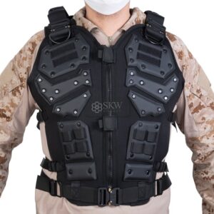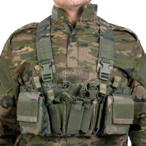 La cummerbund es elástica para facilitar el ajuste al cuerpo y nos brinda comodidad a la hora de ajustar el chaleco a nuestro contorno del torso. El propio chaleco viene con un panel para 3 cargadores de AR. Los tirantes de los hombros están acolchados para que sea mucho más cómodo el chaleco.