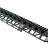 Hay un riel Weaver/Picatinny corto hacia la parte frontal del riel accesorio Saber Tactical FX Panthera y cuenta con múltiples ranuras M-LOK en ambos lados. Esas ranuras están colocadas muy altas, lo que le permite montar contrapesos en el riel sin interferir con el bípode. Hay una textura rugosa en la parte inferior del riel de accesorios, que brinda mayor agarre cuando usa una bolsa de tiro.