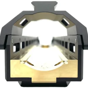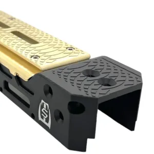Este riel accesorio Saber Tactical FX Panthera está hecho de aluminio liviano. Tiene pesas de latón que se pueden quitar. Uno de esos pesos de latón se encuentra en la parte inferior del riel. Si quitas ese peso, puedes montar una botella de 300 cc en la parte delantera de la FX Panthera. Algo que no es posible con el carril estándar.