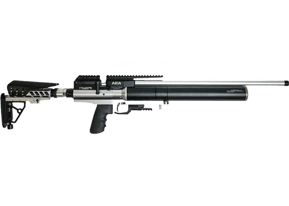 Este rifle AEA Challenger Pro 29.5» PCP es una versión mejorada del Challenger SL normal. La culata de madera se sustituye por una culata ajustable de aluminio y material sintético resistente a los impactos, lo que permite un mayor control sobre la postura de disparo. El rifle tiene una empuñadura ergonómica estilo pistola con ranuras para los dedos premoldeadas, por lo que puede sostener el Challenger con firmeza pero comodidad. La palanca lateral tiene un tirón suave y el seguro se encuentra en el lado derecho del marco, justo encima del gatillo. Esta ubicación y la facilidad de uso permiten el funcionamiento táctil del rifle, sin tener que apartar la vista del objetivo. La acción utiliza una sonda de clavijas, que permite el máximo flujo de aire.