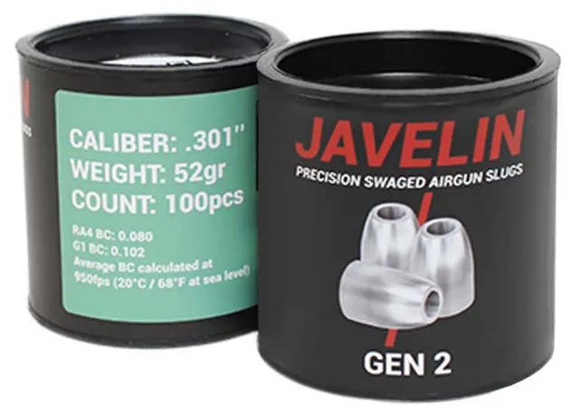 Las balas de pistola de aire comprimido Javelin Gen 2 de 7,62 mm y 52 gramos (.301) tienen una forma aerodinámica, lo que te permite dispararlas muy lejos. Tienen una trayectoria recta, ayudada por el peso de la bala de 52 granos. Están hechos de plomo blando y están estampados con precisión con tolerancias extremadamente ajustadas. Se garantizan resultados consistentes. Las balas de pistola de aire tienen una punta hueca que permite que la correa blanda se expanda rápidamente tras el impacto. Esto significa que las balas de pistola de aire comprimido Javelin Gen de 7,62 mm y 52 gramos (.301) ofrecen una sólida transferencia de potencia en el momento del impacto. Las balas de aire comprimido se empaquetan por 100 unidades.