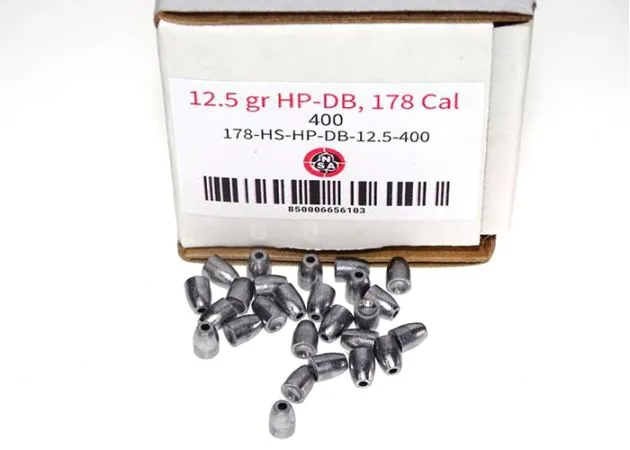 La punta hueca, combinada con un grado suave de plomo, proporciona una excelente expansión. Gracias a su forma de bala con base de plato, la bala de aire comprimido Nielsen HPDB de 4,5 mm y 12,5 granos (.178) tiene un coeficiente balístico de 0,070. La bala tiene una longitud de 0,234″ (5,9 mm).