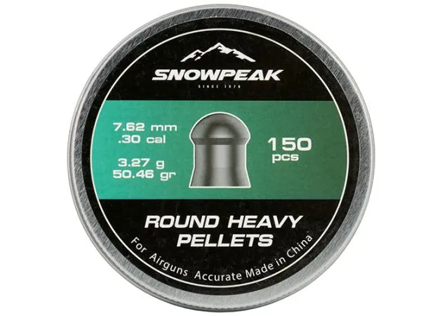 Los balines de aire comprimido Snowpeak Round Heavy de 7,62 mm pesan 50,46 granos y cuentan con una cabeza en forma de cúpula, lo que les proporciona una trayectoria estable y un gran coeficiente balístico.