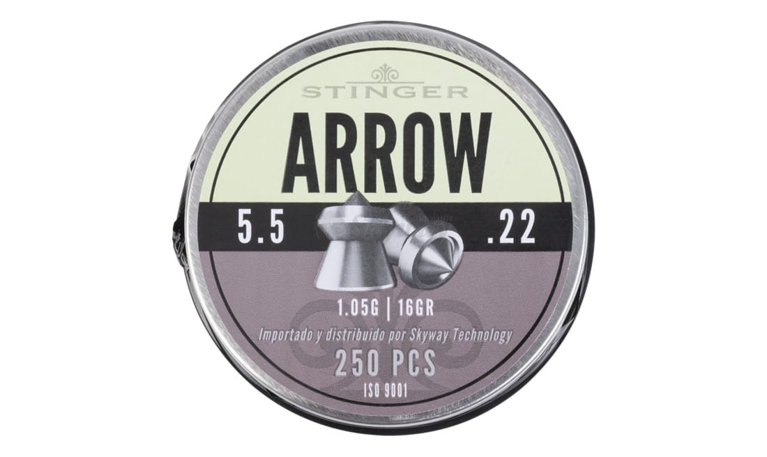 Balines STINGER Arrow 5.5 mm, 250 uds. Ideales para caza y tiro al blanco, combinan precisión y potencia en cada disparo. Su diseño aerodinámico asegura un vuelo estable, siendo perfectos para rifles de aire comprimido.