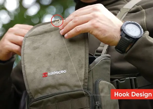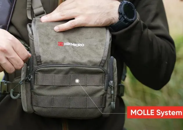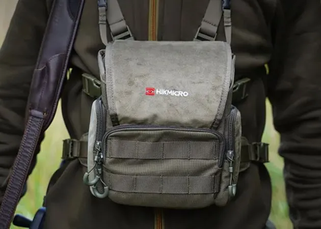 La bolsa de transporte del arnés binocular HikMicro está hecha de un material suave y silencioso y cuenta con tres bolsillos externos para baratijas, mientras que la parte delantera también luce dos filas de bucles MOLLE.