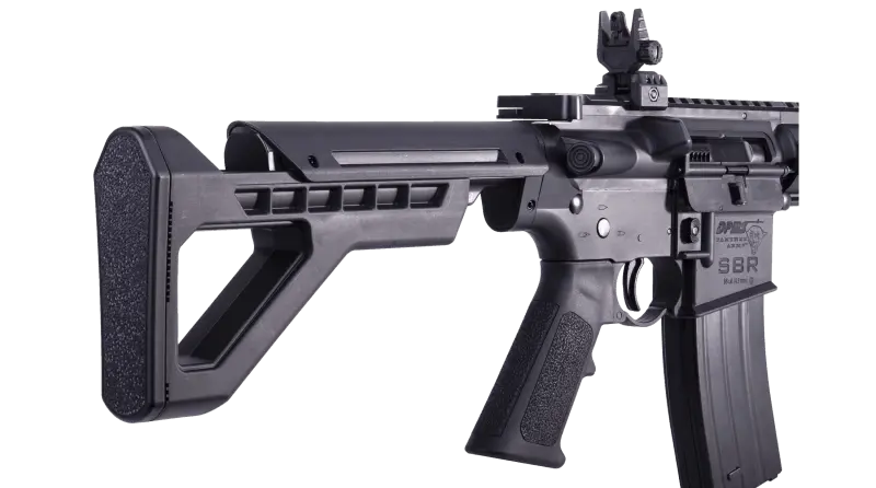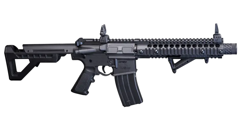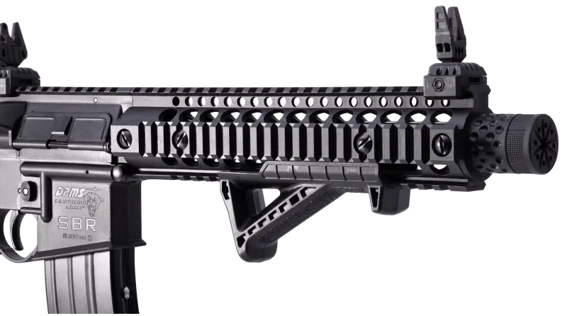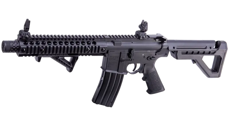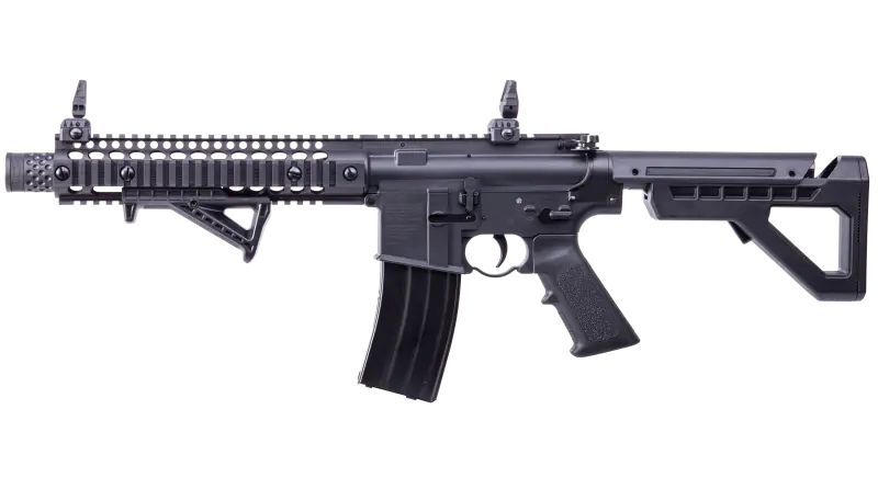 CARACTERÍSTICAS – Carabina CO₂ Tactical con acción semi-automática – Cargador drop out para BB 25 tiros, compatible con perdigones de 4,5mm BB acero tradicionales – Culata ajustable en 6 posiciones – Empuñadora compatible https://youtu.be/Fvi7y-xxQxQAK y culata ajustable en 6 posiciones – Guardamanos Quad con carriles para montar accesorios – Peso y acciones reales CARABINA CO₂ CROSMAN SEMI AUTO SBR CALIBRE: 4,5mm VELOCIDAD: 130 m/sg