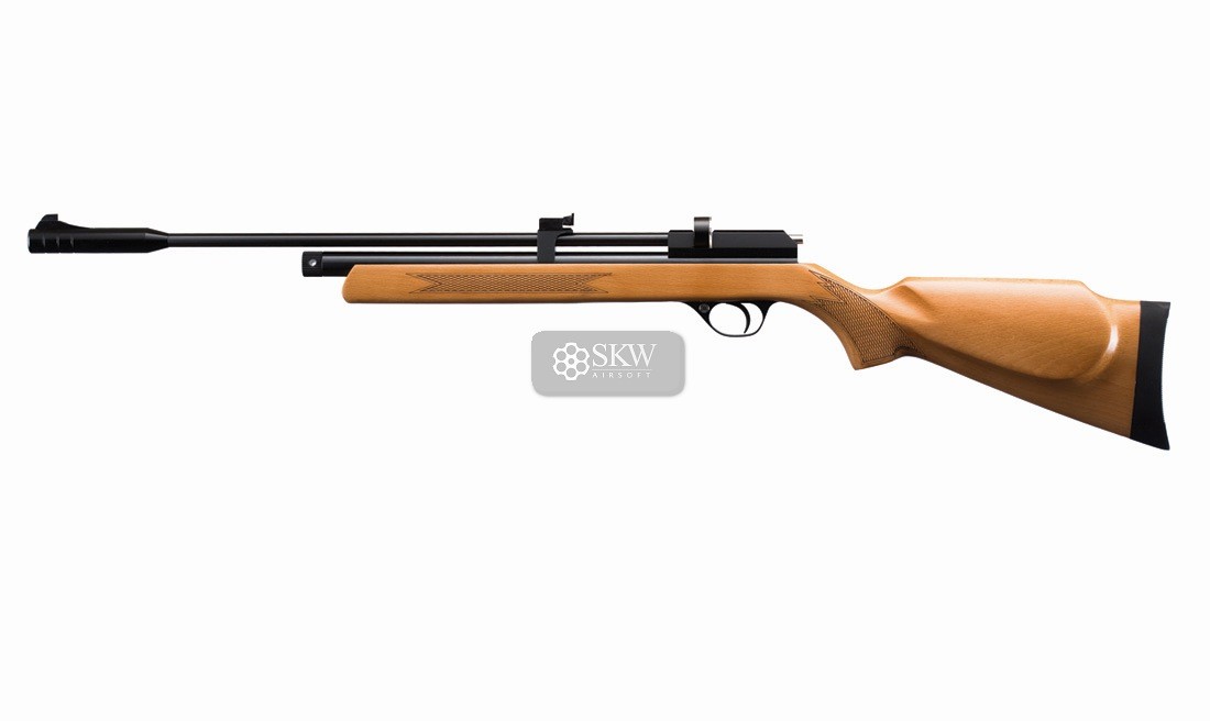 Ligera carabina de CO2 con capacidad de docenas de disparos de alta potencia (hasta 12 julios). Posibilidad de usarse con cargador o como carabina monotiro. Acabada en madera. Incluye seguro manual, gatillo ajustable, silenciador y alza y punto de mira.