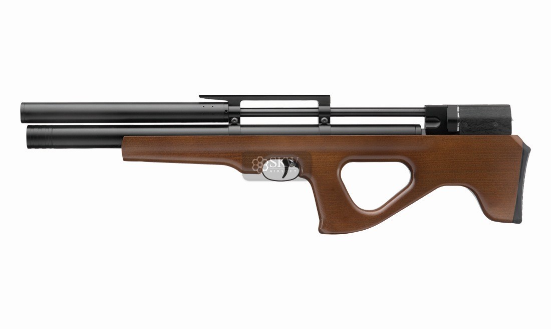 Carabina estilo «bullpup” de PCP con cuerpo de madera. Esta carabina tiene un depósito de aire de alta capacidad (265cc) que la dota de gran autonomía de tiro. Modelo de alta precisión para tiro deportivo. Cuerpo ergonómico que se adapta perfectamente a cualquier tirador. Gracias al supresor incorporado se elimina por completo el ruido y el retroceso al disparar. Manómetro incorporado.