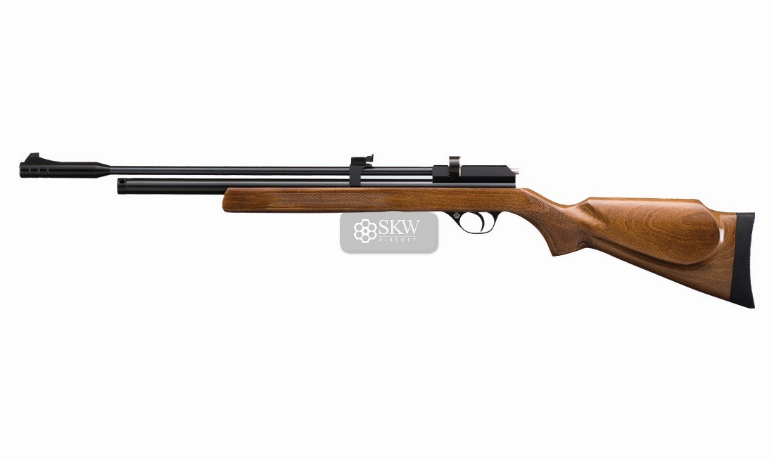 Carabina de PCP con depósito de 100cc. Hasta 40 disparos con 24 julios de potencia. Posibilidad de usarse con cargador o como carabina monotiro. Acabada en madera. Incluye seguro manual, gatillo ajustable, silenciador y alza y punto mira.