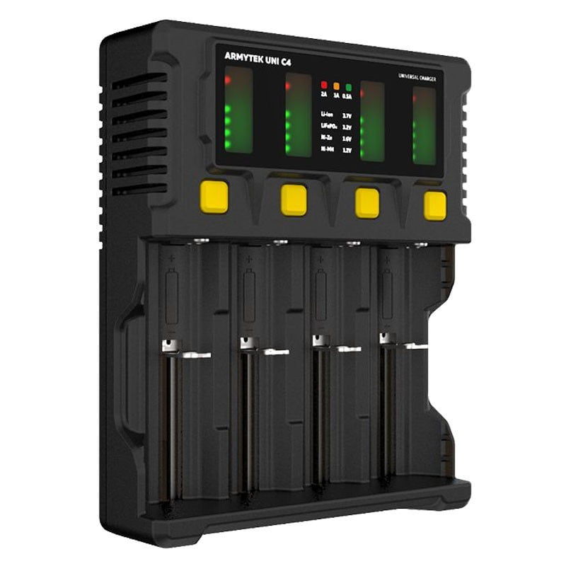 El ARMYTEK Uni C4 es un cargador universal con detección automática inteligente del tipo de batería, nivel de carga y corriente óptima. Carga simultáneamente hasta 4 baterías de diferentes tipos con hasta 2A de corriente. Un botón separado para cada canal proporciona una operación manual simple. Adaptador de coche en el set.