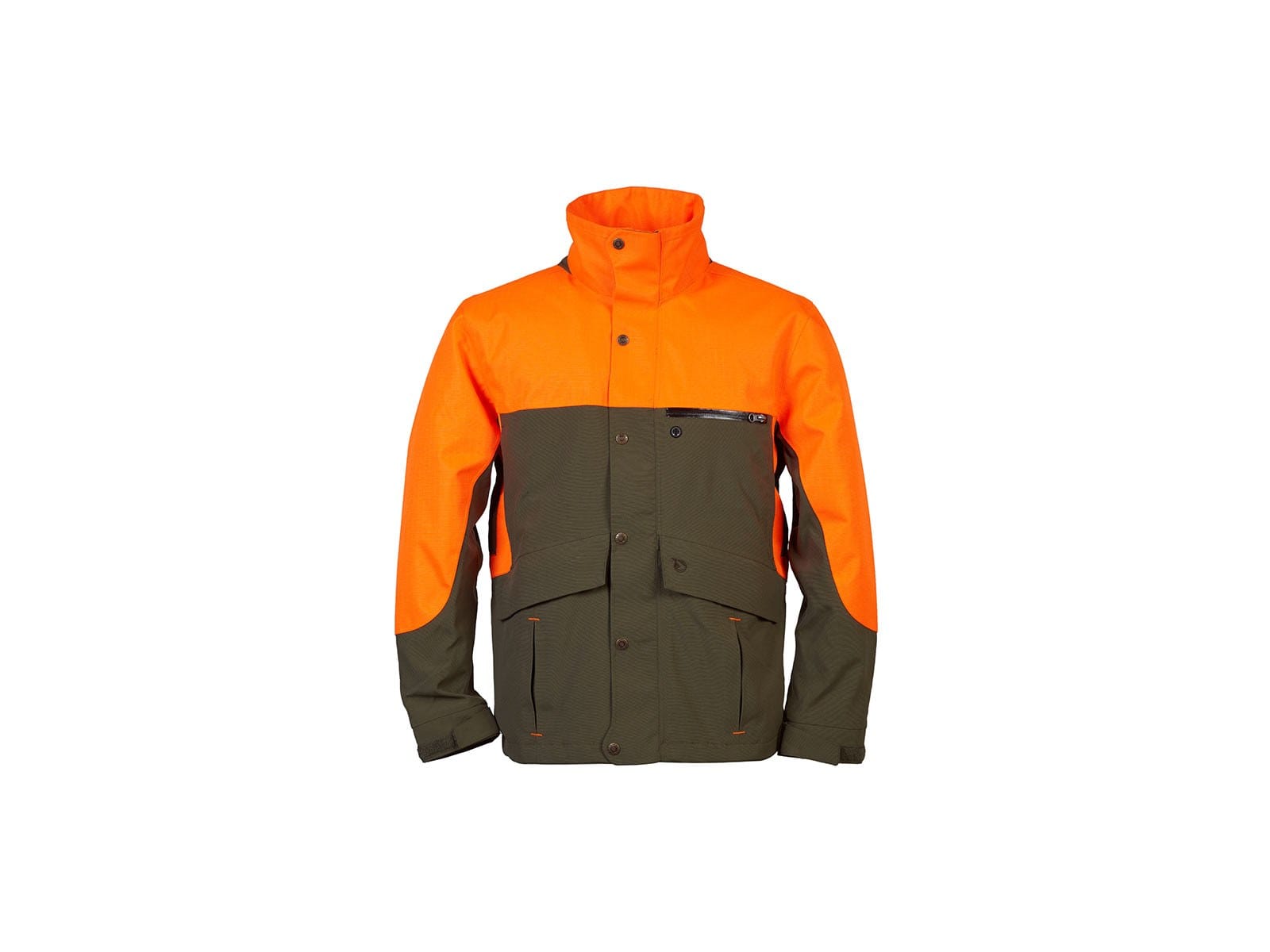 Chaqueta con membrana, resistente al agua, transpirable y cortavientos. Refuerzo Naranja Alta visibilidad para una caza segura, de tejido muy resistente para proteger de los desgarros. Con cremalleras en las axilas para una mejor transpiración, capucha ajustable y plegable en cuello. Puños y bajos ajustables.