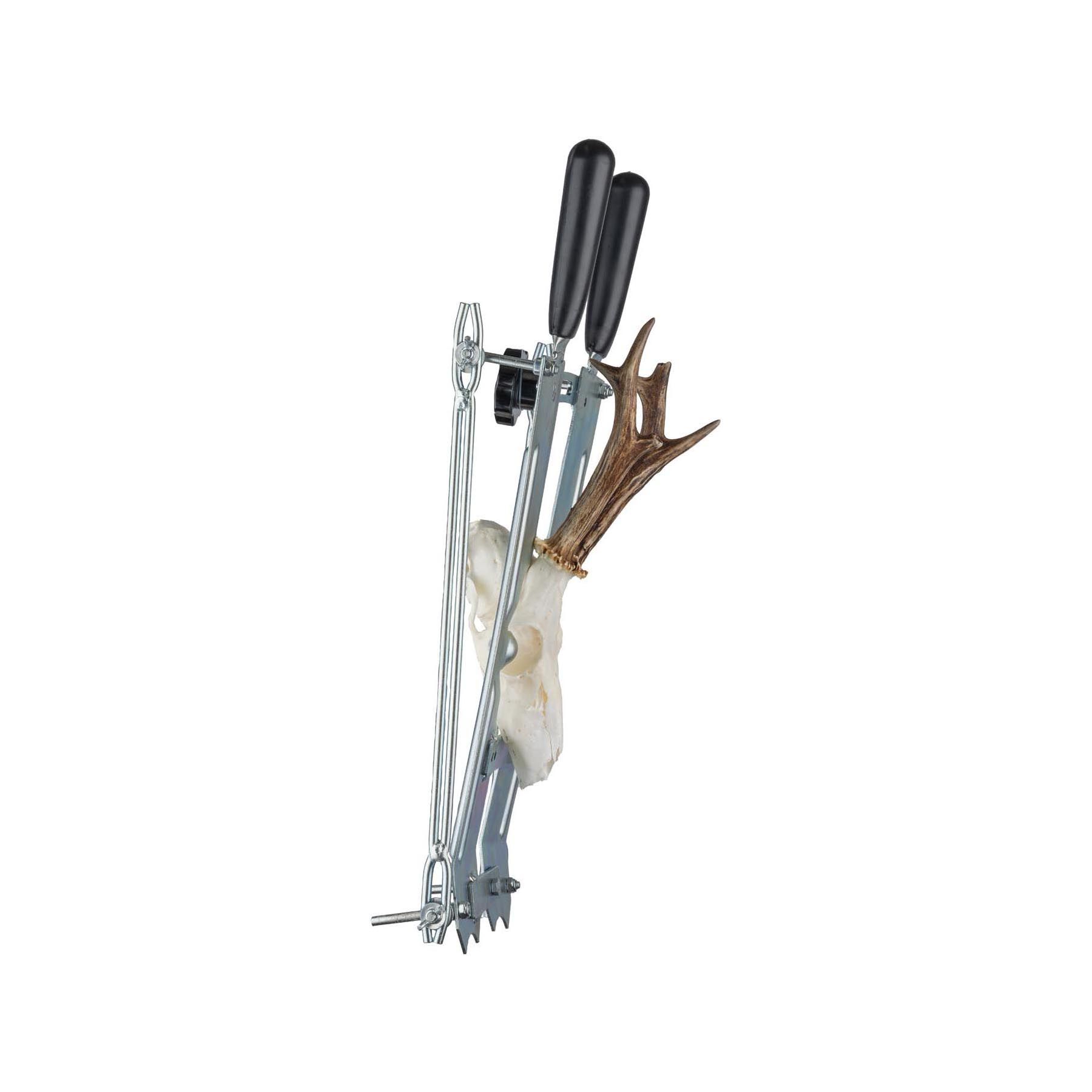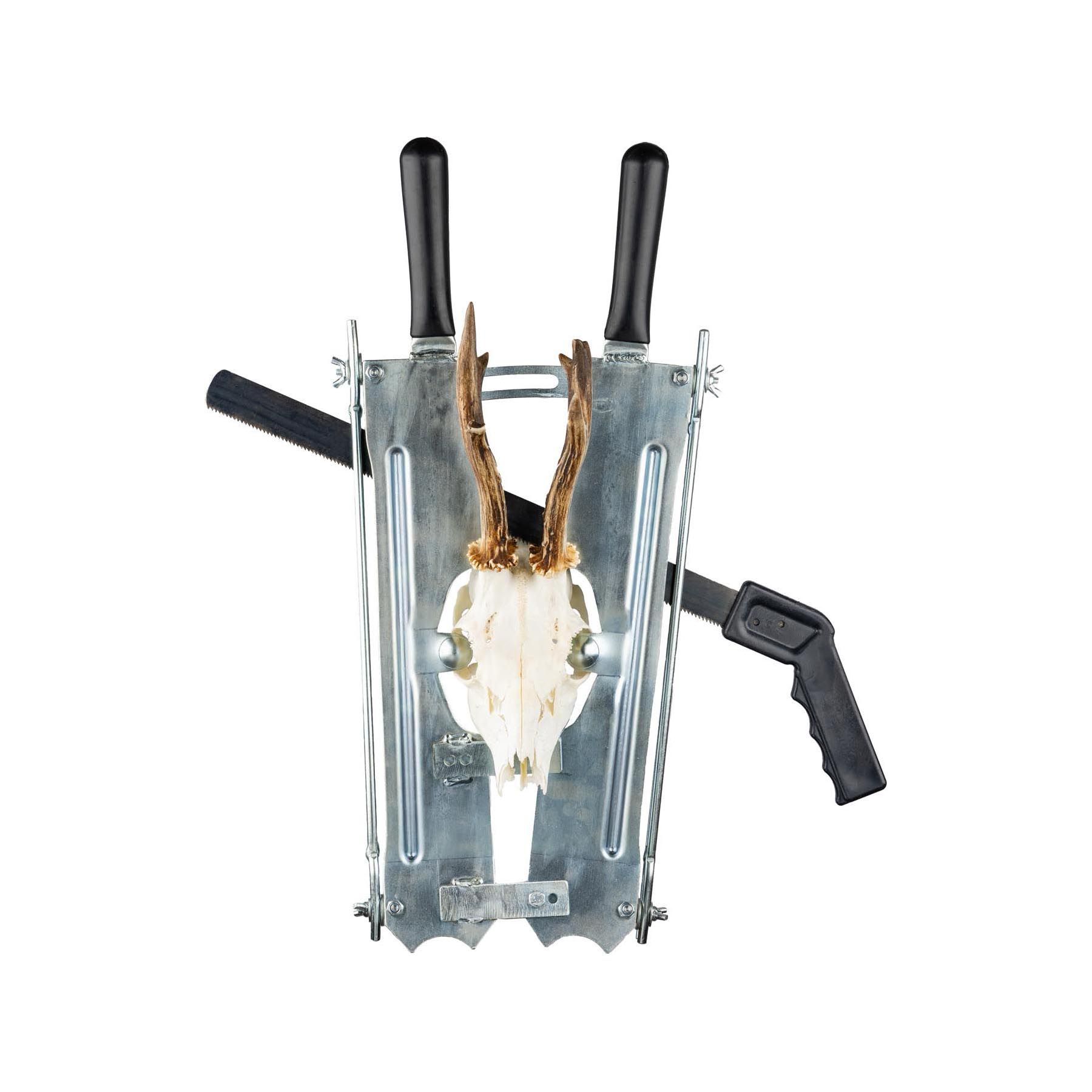 El cortador y además  extractor  de cuernos  es una herramienta indispensable para todo cazador que quiera preparar su trofeo . Fabricado en acero galvanizado de alta calidad, es extremadamente robusto y duradero. El dispositivo viene con un riel con guía variable y una sierra que evita que se incline y se enganche, lo que permite un corte uniforme, suave y preciso. El corte es tan preciso que no requiere ningún tratamiento adicional. Además, el ángulo del dispositivo es ajustable para asegurar un ajuste perfecto a las cuernas.