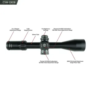 El Crimson Trace CSA-2416 2 Series es un visor de rifle de rango medio de 4-16×50 mm rico en características que ha sido construido desde cero con un propósito específico. El visor de primer plano focal (FFP) y la impresionante claridad del cristal ED japonés ofrecen una experiencia de disparo incomparable. La retícula avanzada MR1-MOA diseñada a medida está completamente iluminada y proporciona puntos de retención rápidos para la deriva y la elevación. Las torretas tácticas expuestas de .25 MOA brindan una sensación precisa y resistente al marcar para obtener los disparos más precisos. Toda la línea de visores Crimson Trace ofrece indicadores de nivelación de montaje EZ para un montaje rápido y preciso y un anillo de alineación rojo para la colocación adecuada del ojo. Todos los visores Crimson Trace forman parte del programa de Baterías Gratis de por vida del fabricante y están cubiertos por la Garantía de Protección de por Vida del Fabricante.