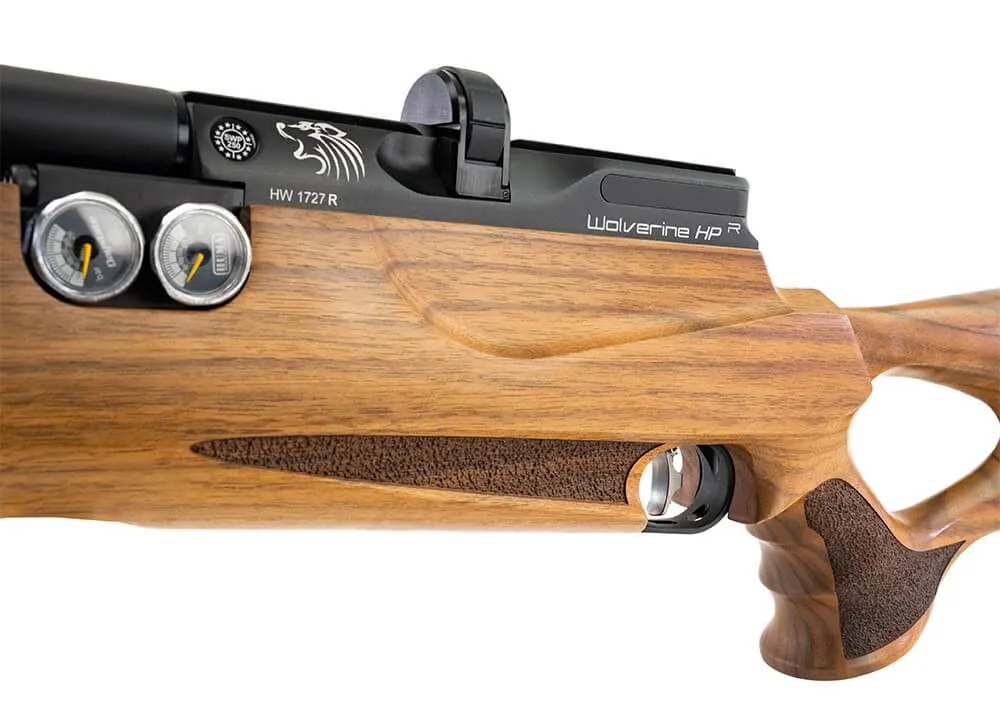El Wolverine R HP HiLite en Walnut, de Daystate, está regulado por un regulador Huma-Air (R), que garantiza disparos sucesivos consistentes y también mejora la precisión general. Esta carabina de aire comprimido se puede amartillar con la palanca lateral cómodamente operable en el lado derecho, que se puede invertir hacia el lado izquierdo, pero solo por artesanos certificados designados por Daystate. El gatillo de grado de coincidencia cuenta con dos etapas, se puede ajustar el tirón del gatillo y el peso del gatillo de la primera etapa, mientras que el peso del gatillo de la segunda etapa también se puede ajustar. Además, la zapata del gatillo se puede ajustar en altura y ángulo para adaptarse a los requisitos del tirador.