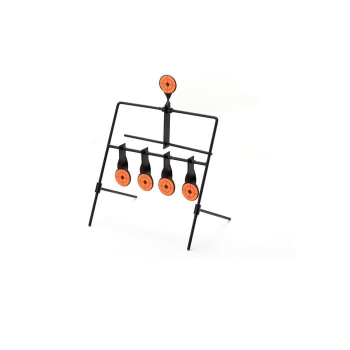 Diana para galería de tiro Ressetting Target T20 Medidas: (ancho)270mm*(alto)375mm Peso: 688g Material: hierrro Color: negro y naranja fluorescente Ideal para carabinas / pistolas de aire comprimido 5 dianas,4 de galeria,una diana de resetting Una vez derribadas todas las dianas dispare sobre la de resetting y volveran a quedar listas para la siguiente ronda