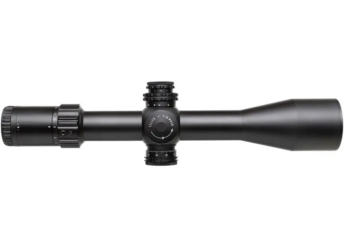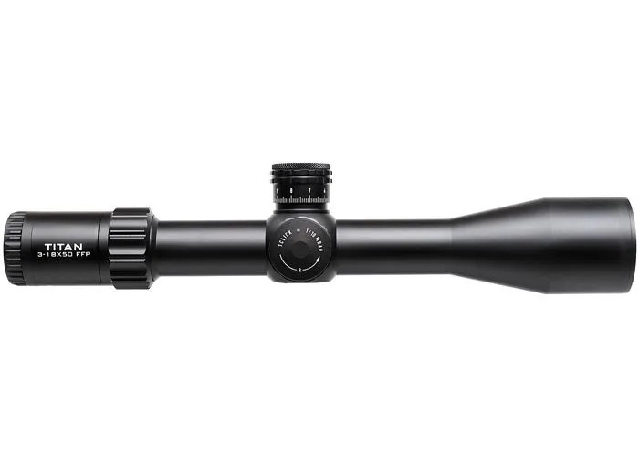 El visor para rifle Element Optics Titan 3-18×50 APR-2D cuenta con lentes totalmente multicapa, hechas de vidrio ED transparente para una imagen brillante con mucho contraste. Un aumento máximo de 18x permite el uso de un objetivo de 50 mm, sin concesiones a la transmitancia de la luz. Esto significa que el Titan podría mantenerse compacto, permitiendo un montaje bajo cerca del cañón. Además, el objetivo más pequeño ofrece una profundidad de campo más tolerante, lo que permite un ajuste de paralaje menos crítico.