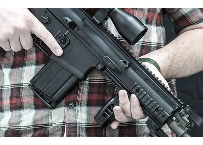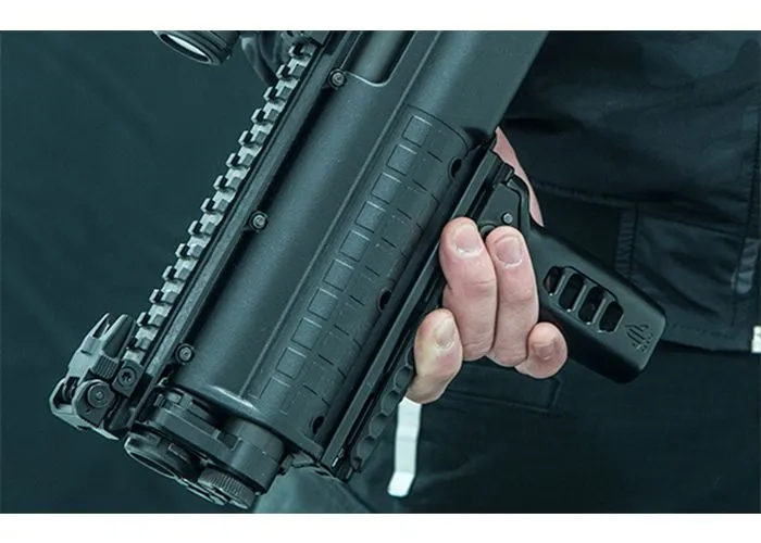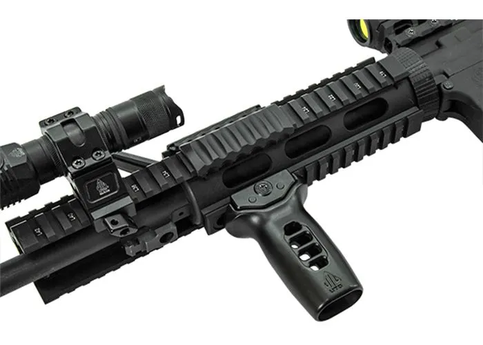 Su diseño vertical mejora la estabilidad y precisión al disparar, siendo ideal para mejorar el control del arma en diversas situaciones tácticas o de tiro.