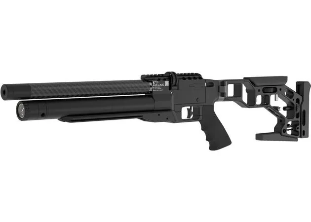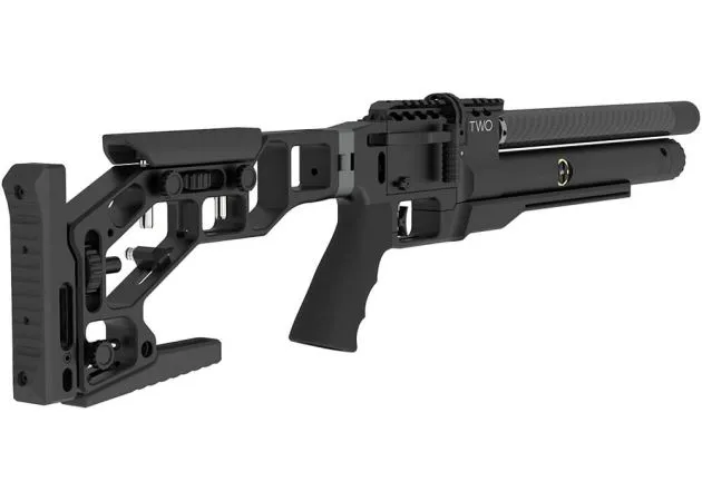 Con una carabina de aire comprimido presurizada de largo alcance como la Epic Airguns Two Tactical Compact CZUB, la estabilidad es de suma importancia. Debido a esto, la culata es totalmente ajustable. El reposamejillas es ajustable verticalmente y la hombrera es ajustable vertical y horizontalmente. Esa hombrera está hecha de goma, lo que amortigua un poco el retroceso del rifle. Hay un monopié retráctil en el lado izquierdo de la hombrera. Si tiene un bípode montado en el rifle, puede usar el monopié para colocar firmemente el rifle sobre una superficie. Hay un ciclista de bolsa larga en la parte inferior de la culata, que también puede usar para aumentar la estabilidad. La culata es plegable, por lo que puede disminuir la longitud total con 24 cm para transportar fácilmente las pistolas de aire comprimido Epic Two Tactical Compact CZUB.