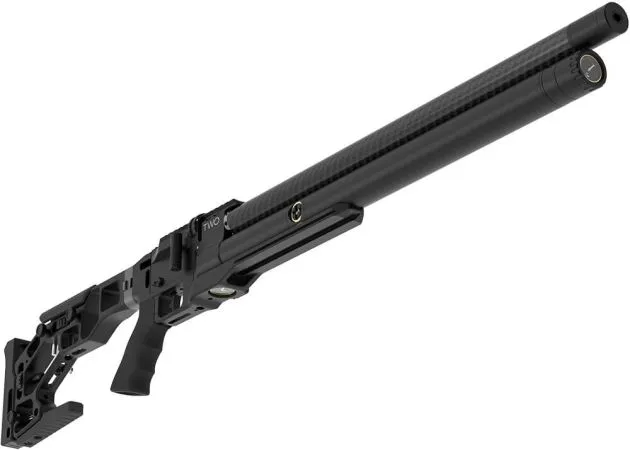 La carabina de aire comprimido presurizada Epic Airguns Two Tactical Standard tiene un cañón CZUB de alta precisión con una longitud de 550 mm. Hay una rosca de 1/2 UNF en el extremo del cañón, que se puede usar para colocar un moderador o un freno de boca. Encontrará el depósito de aire presurizado de 240 cc debajo del cañón. El manómetro en la parte delantera del depósito indica claramente la presión. Hay un puerto de llenado no muy lejos del medidor, que le permite llenar fácilmente el depósito. La Epic Airguns Two Tactical Standard CZUB tiene un regulador que se puede ajustar externamente, lo que garantiza que se utilice exactamente la misma cantidad de aire presurizado para cada disparo. Hay un manómetro en la parte inferior del marco, colocado cerca del gatillo, que puede usar para medir la presión del regulador. El riel de accesorios Arca Swiss debajo de la parte delantera le permite montar fácilmente la carabina de aire comprimido presurizada en un soporte para pistola.