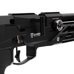 La parte delantera del chasis Saber Tactical cuenta con un riel de accesorios Arca-Swiss de los cuales la parte delantera tiene un pequeño extremo Picatinny, mientras que los lados tienen ranuras en T para accesorios M-LOK. Se utiliza una empuñadura FX auténtica y el chasis tiene cazoletas al ras para eslingas giratorias QD.