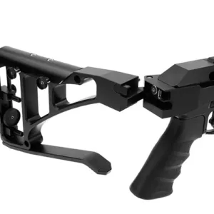 El chasis Saber Tactical está mecanizado con extrema precisión a partir de aluminio de alta calidad y ofrece una gran cantidad de opciones y posibilidades de ajuste, de las cuales la culata plegable es una de las primeras que llama la atención. La culata se bloquea de forma segura con un sistema de desbloqueo fácil y, cuando se pliega, se mantiene en su lugar contra el chasis mediante un sutil imán.