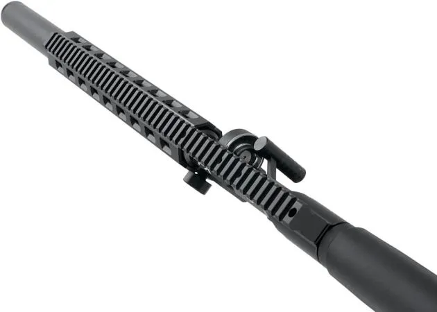 El FX DRS Tactical 500 es el primer PCP de FX con el depósito de aire montado alrededor del cañón. No hay cilindro o botella debajo del cañón, lo que ofrece la ventaja de que el perfil se reduce significativamente. Esto te ayudará en tu postura de tiro, pero también significa que transportar y almacenar el FX DRS Tactical 500 ocupará menos espacio. La capacidad de aire del depósito es de 210 cc.