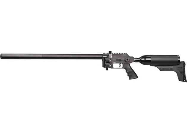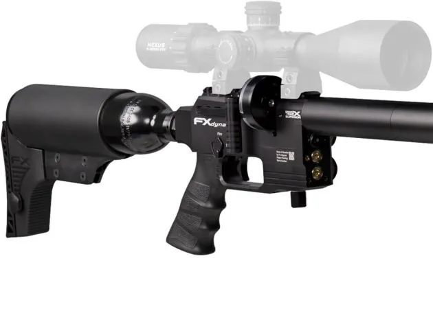 • Cámara de aire dinámica : en el interior de la cámara de aire, el aire ya regulado está listo para el siguiente disparo. La cámara de aire está disponible en diferentes capacidades y cuanto mayor sea el calibre y más pesado el proyectil, más capacidad necesitará dentro de la cámara de aire. Los tamaños de cámara de aire disponibles son: Macro (62 cc) y Magnum XL (156 cc). El FX Dynamic 600 VP tiene una cámara de aire Magnum XL de 156 cc alrededor del cañón.