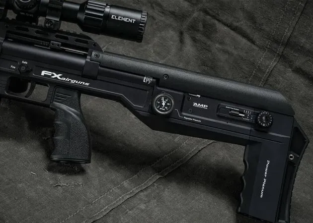- Regulador AMP MkII: regula la cantidad de aire comprimido que ingresa a la cámara de potencia y se puede ajustar externamente para que coincida con la presión de la munición preferida y logre una mayor precisión.