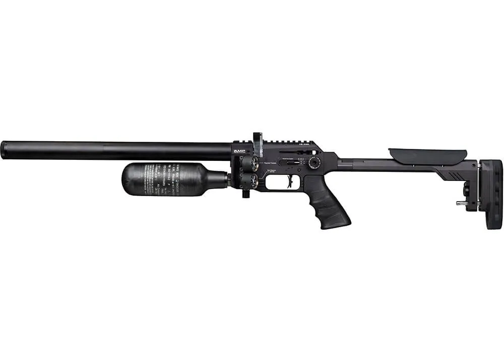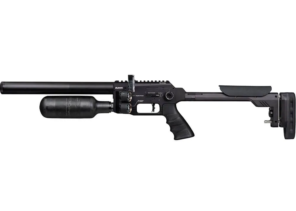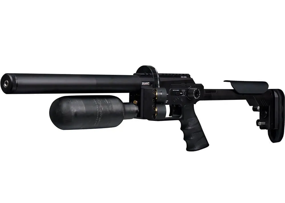 • Regulador: el regulador único AMP MKII tiene su propio manómetro y puede ajustarse meticulosamente. Te permite reducir la presión proveniente de la botella de 250 bares (300 cc y con su propio manómetro) para crear la presión perfecta dentro del plenum y coincidir con la munición elegida.