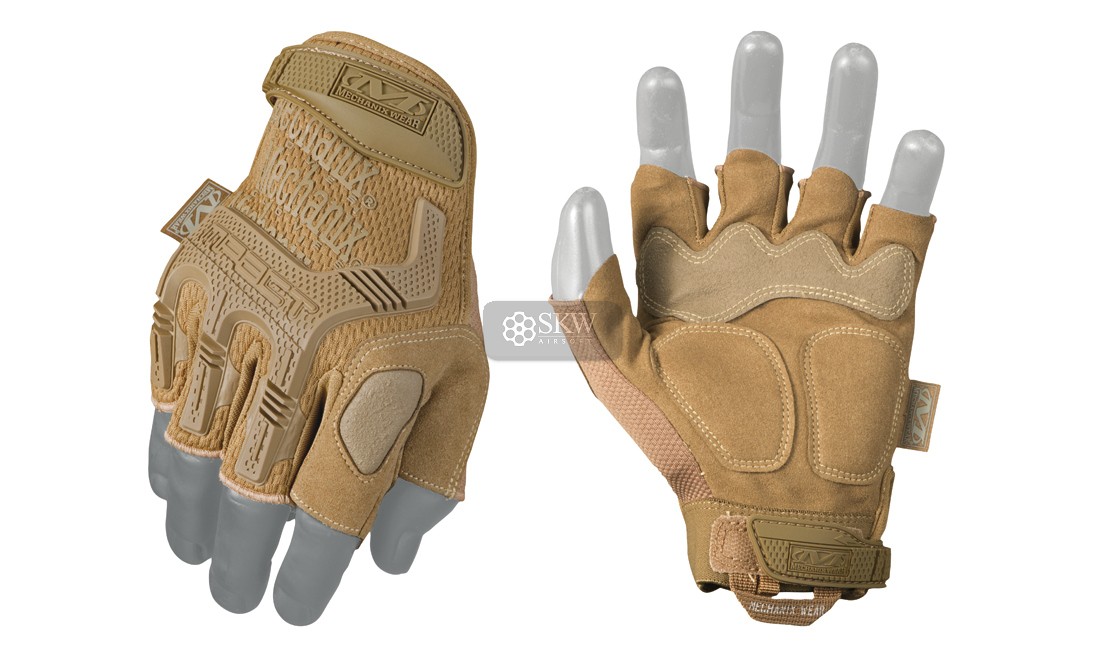 Guantes Mechanix M-Pact Fingerless Coyote: diseño sin dedos, protección robusta y precisión incomparable.