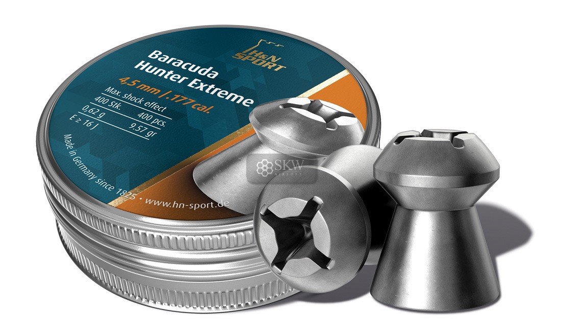 H&N Baracuda Hunter Extreme 4,5 (400): Balines de 4,5 mm con punta expandible para una mayor expansión y poder de detención. Perfectos para caza y tiro de alta precisión. Caja de 400 unidades.
