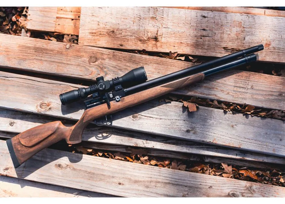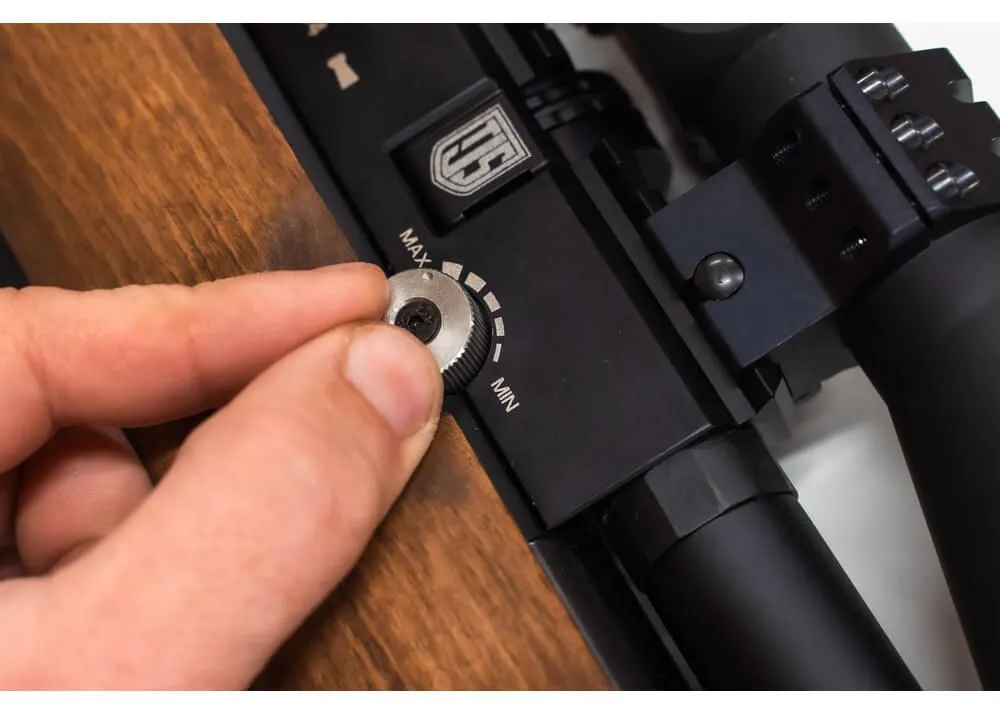 La JTS Airacuda es una carabina de aire comprimido PCP con un aspecto elegante, cuya potencia de disparo se puede ajustar con un dial en el lado derecho de la acción.