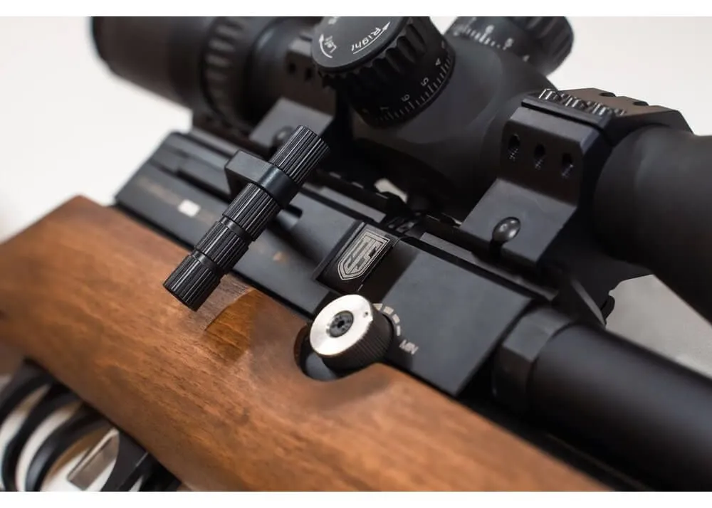 Una banda de barril entre el cañón y el depósito de aire presurizado garantiza una construcción rígida para proporcionar más precisión. La tapa en el extremo del depósito de aire presurizado cubre la conexión Foster. Esta conexión permite que la carabina de aire comprimido se llene rápidamente con aire a presión. Una vez que se ha llenado por completo, se pueden disparar aproximadamente 30 tiros (lo que depende de la potencia del disparo).