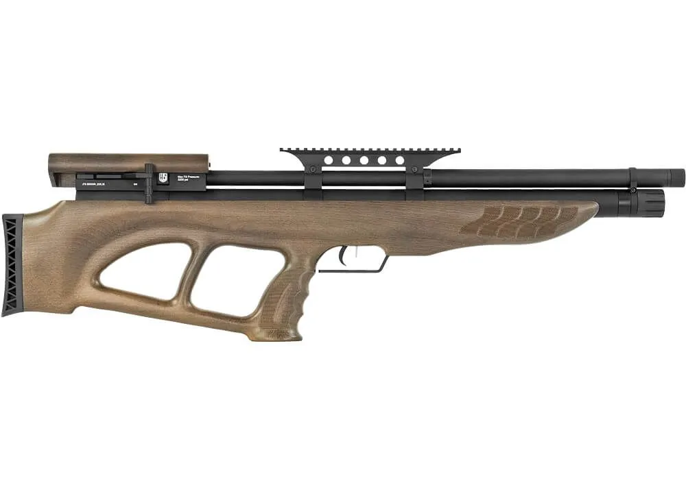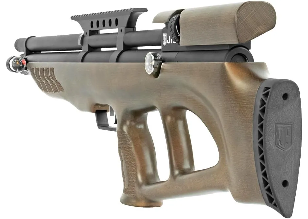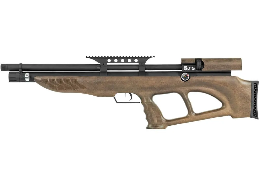 Este rifle JTS Brawn bullpup PCP está fabricado íntegramente en metal y tiene una culata de madera bellamente acabada. Tiene un cañón con una longitud de 437 mm y tiene una longitud total de 838 mm. El Brawn tiene un diseño robusto y pesa aproximadamente 4220 gramos, lo que se puede atribuir a la construcción completa de metal y madera. Y, sin embargo, el rifle de aire comprimido se siente muy bien para sostenerlo en sus manos. La culata de madera presenta una empuñadura ergonómica tipo pistola con ranuras para los dedos premoldeadas y una textura rugosa y grabada con láser en ambos lados. Esa textura también está grabada con láser en los lados de la parte delantera y proporciona un poco más de agarre. La culata tiene un orificio para el pulgar, lo que permite disparar cómodamente y el reposamejillas de madera también es muy cómodo. La cantonera de goma en la parte posterior del JTS Brawn proporciona más estabilidad, lo que mejora enormemente la precisión.