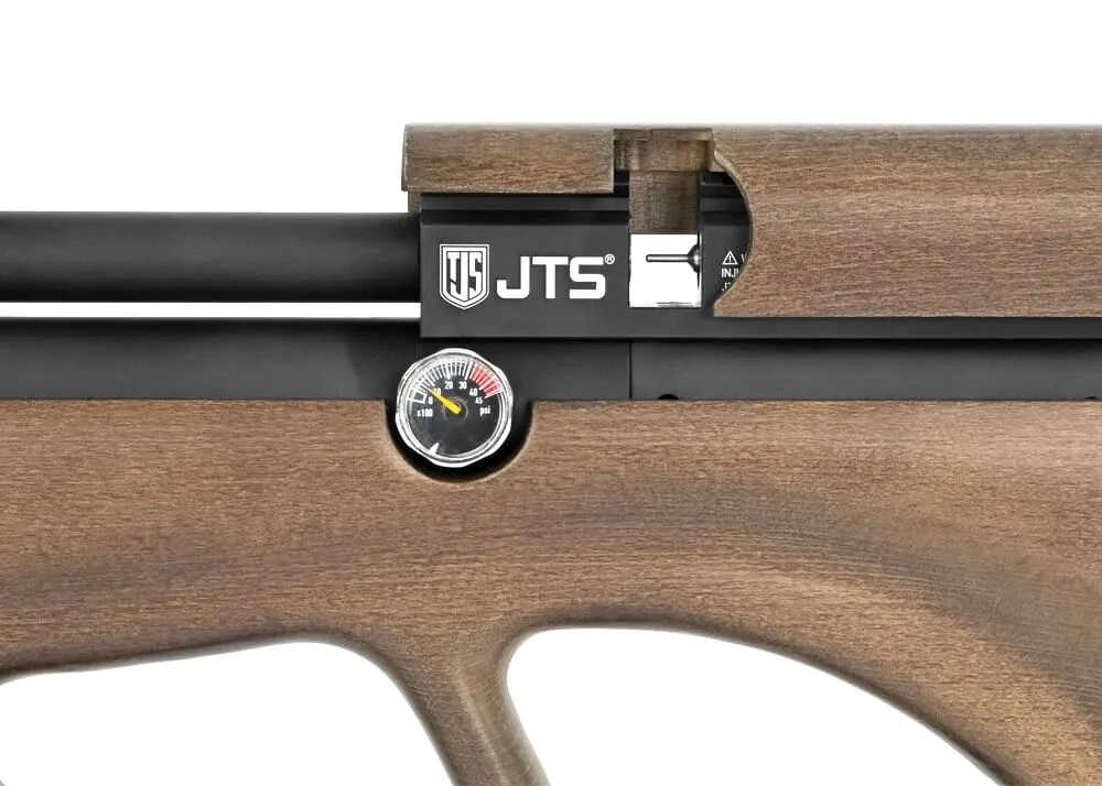 El JTS Brawn utiliza un cilindro PCP con una presión de llenado de 220 bar / 3200 PSI para disparar esos perdigones y el cilindro se encuentra justo debajo de la cubierta del cañón. La cubierta del cañón y el cilindro están conectados con una banda de barril hacia la parte delantera de la cubierta del cañón, que también es donde encontrará un manómetro. Ese manómetro se puede invertir de izquierda a derecha, por lo que el tirador siempre puede vigilarlo. El sistema regulado garantiza una potencia de disparo constante, siempre que la presión sea adecuada. Hay un manómetro en el costado del rifle, que se puede usar para verificar la presión de llenado del regulador.