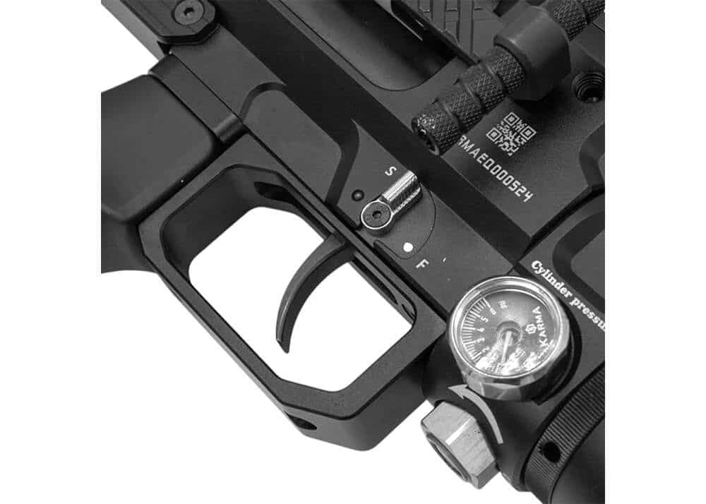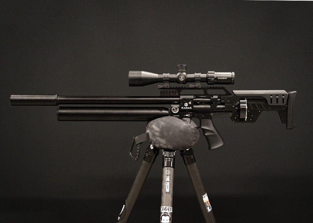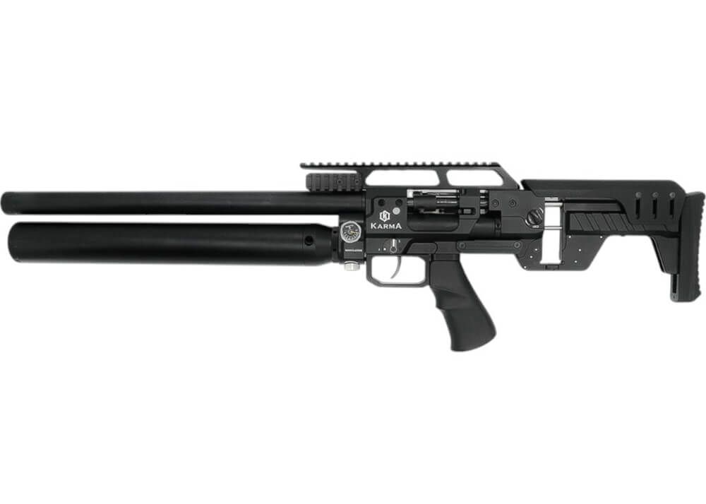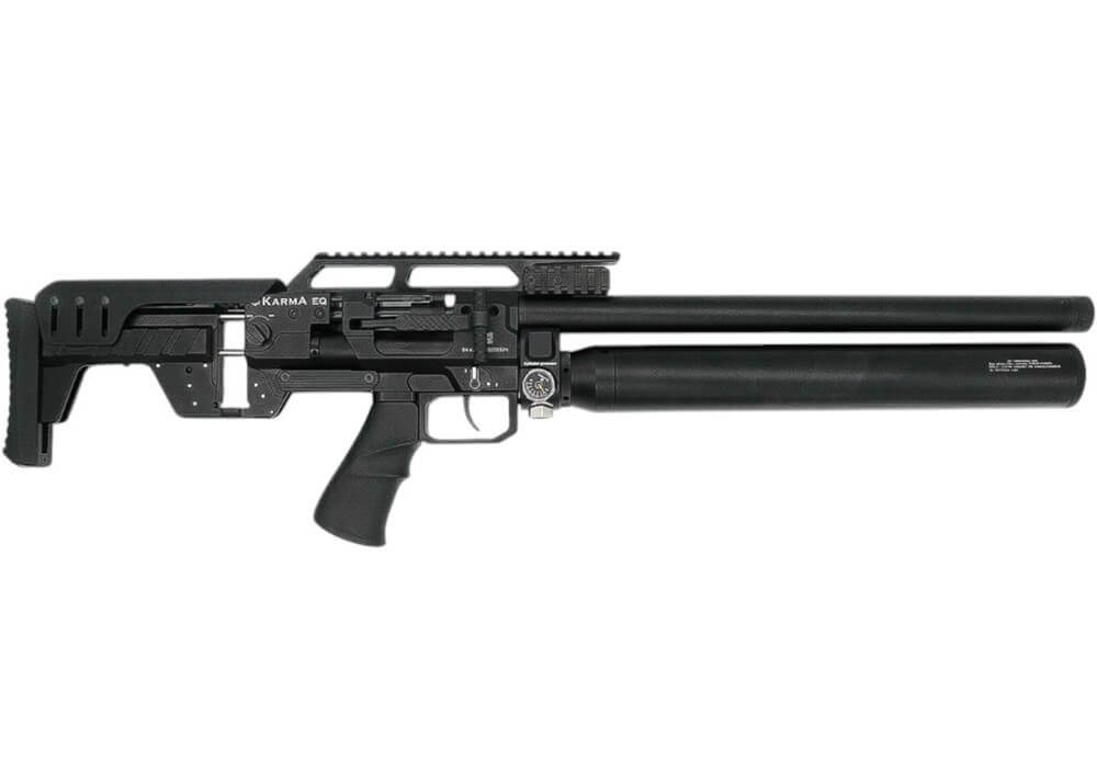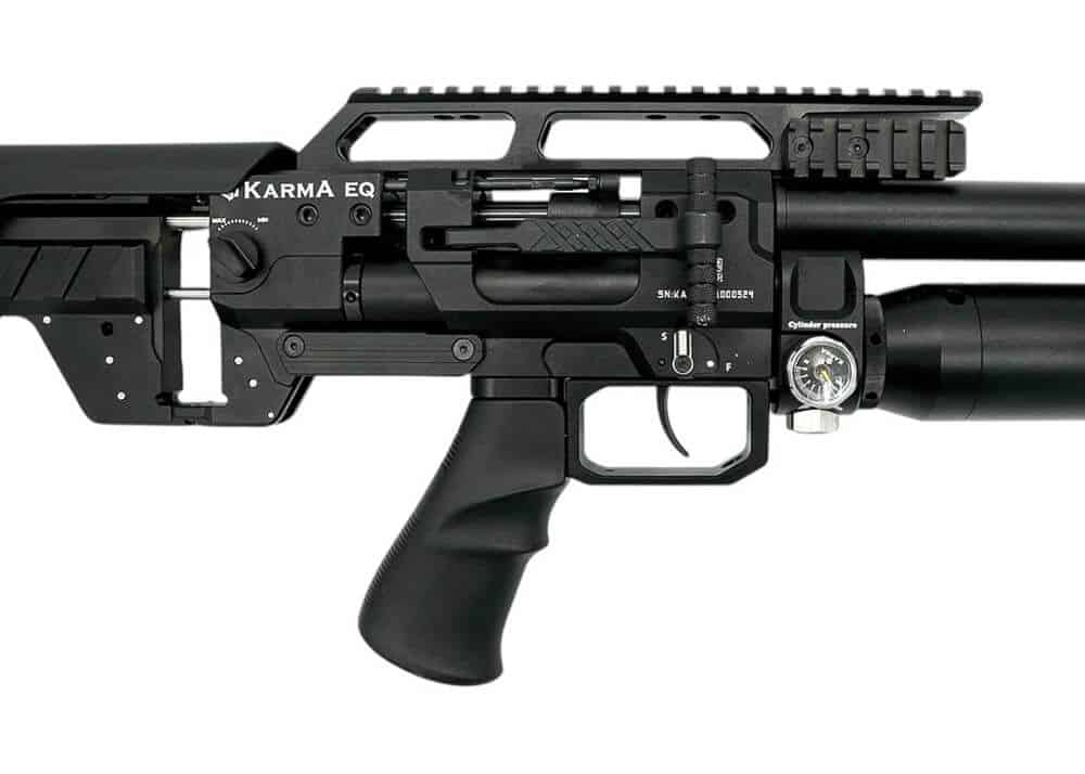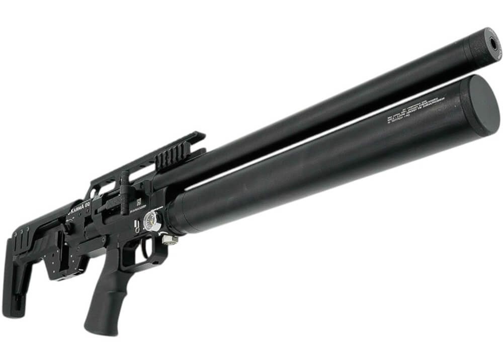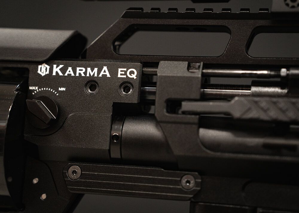 El cañón de 609 mm de largo viene equipado con una cubierta de cañón que tiene un extremo roscado de 1/2×20 UNF con un protector de rosca. El cilindro de aluminio PCP está montado justo debajo del cañón y tiene una capacidad de 500 cc y una presión de llenado de 310 bar, que se utiliza para disparar los perdigones y las balas. El rifle PCP está regulado y se puede ajustar el regulador externamente. El uso de los dos manómetros situados en el lado derecho del bastidor -situado justo al lado de la conexión PCP-cilindro- le permitirá comprobar la presión de llenado restante y comprobar la presión de llenado del regulador. El ecualizador Karma está disponible en varios calibres: