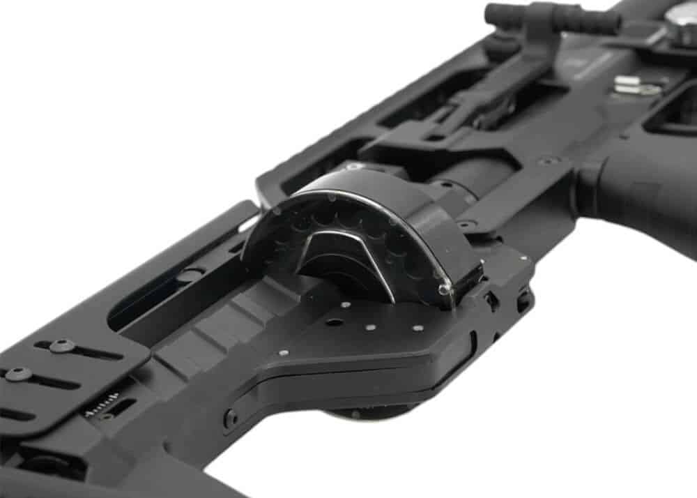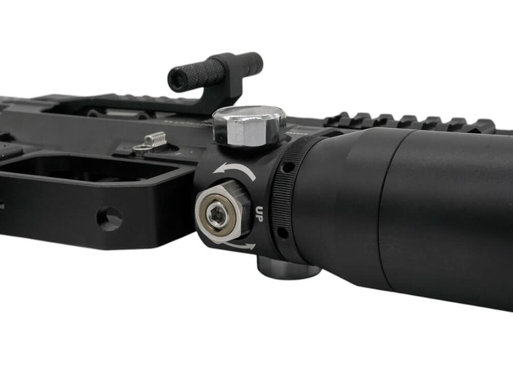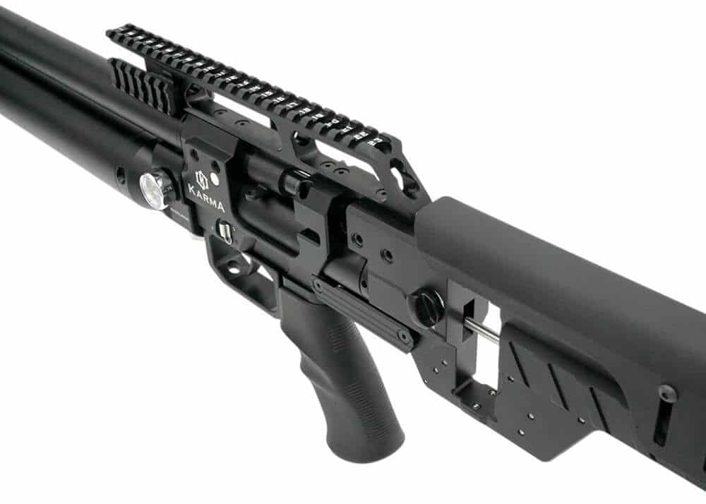 Este rifle Karma EQ PCP tiene un diseño bullpup robusto y funciona de manera excelente en tiros a larga distancia. También está diseñado desde cero para disparar a larga distancia y viene equipado con un riel de visor Weaver/Picatinny de 20 MOA que compensa la puntería del cañón hacia arriba. Disparar a objetivos de largo alcance requerirá que inclines tu rifle hacia arriba. El uso de un riel de mira telescópica plano puede hacer que su objetivo se mueva fuera de su mira. Un riel de visor inclinado de 20 MOA compensa esa elevación de la boca del cañón. Hay un riel Weaver/Picatinny a los lados del riel de visor elevado, que se puede usar para montar accesorios.