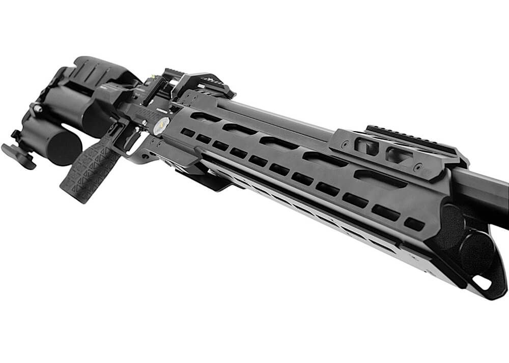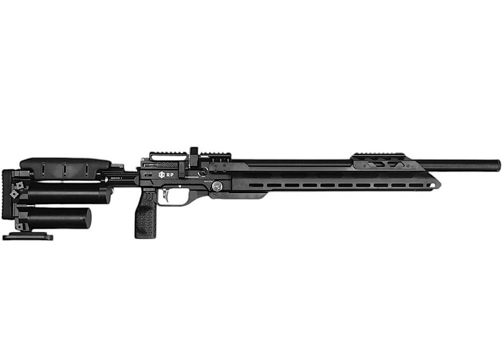 La carabina incorpora un sistema de aire comprimido regulado con dos plenums de 250 cc en total, que proporcionan una actualización de aire rápida para disparos consecutivos y precisos. Los dos cilindros PCP, con una capacidad combinada de 600 cc y una presión de llenado de 310 bares, permiten una gran autonomía y rendimiento en una variedad de calibres, desde 4,5 mm hasta 9 mm.