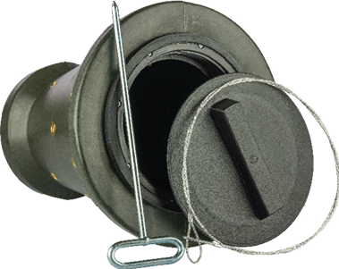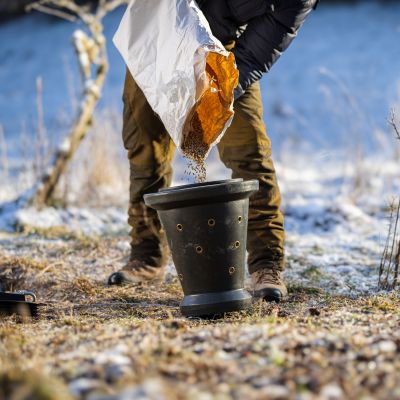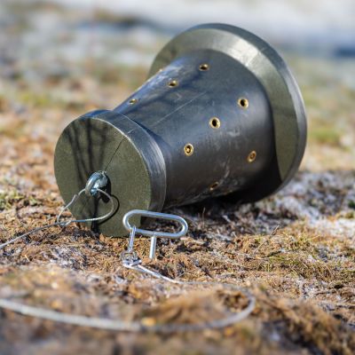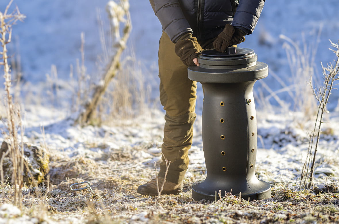 Barril de empuje cónico con piqueta de acero y cable acerado resistente. Capacidad para aproximadamente 18 kg para cualquier tipo de cereal como el maíz, perfecto para los comederos de jabalíes y otras reses.