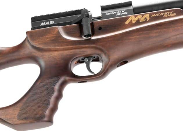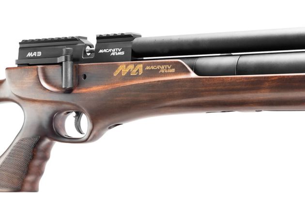 La culata de madera de haya tiene una empuñadura de pistola a cuadros, lo que garantiza un agarre seguro y cómodo en todo momento. El diseño ambidiestro de Macavity del MA3 Beech Long garantiza un uso cómodo tanto para usuarios zurdos como diestros. Se pueden instalar accesorios como un bípode en el raíl inferior M-LOK en la parte delantera, mientras que un raíl de montaje Weaver/Picatinny en la parte superior permite la instalación de ópticas. Además, la culata tiene un soporte QD para correa.
