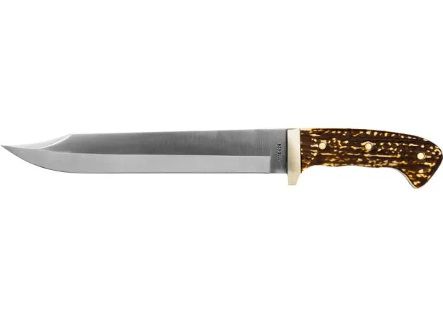 El mango consta de dos escamas hechas de Staglon. El ciervo está hecho de astas de ciervo que se han caído naturalmente y tiene un aspecto icónico. Para este machete Uncle Henry Bowie Full Tang 181UH, los diseñadores decidieron utilizar Staglon, que es una versión sintética del material Staglon. Esto significa que no se utilizaron productos de origen animal en la producción de las básculas, pero siguen teniendo ese aspecto natural e icónico. El mango está ligeramente premoldeado y se siente muy bien al sostenerlo en las manos.