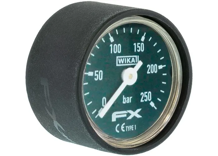 Este manómetro WIKA de 27 mm y 250 bares es un elemento estándar en la carabina de aire comprimido FX Impact M3 y se puede adaptar a versiones anteriores de la FX Impact. El manómetro es un instrumento de precisión de fabricación holandesa con una carcasa de latón duradera.