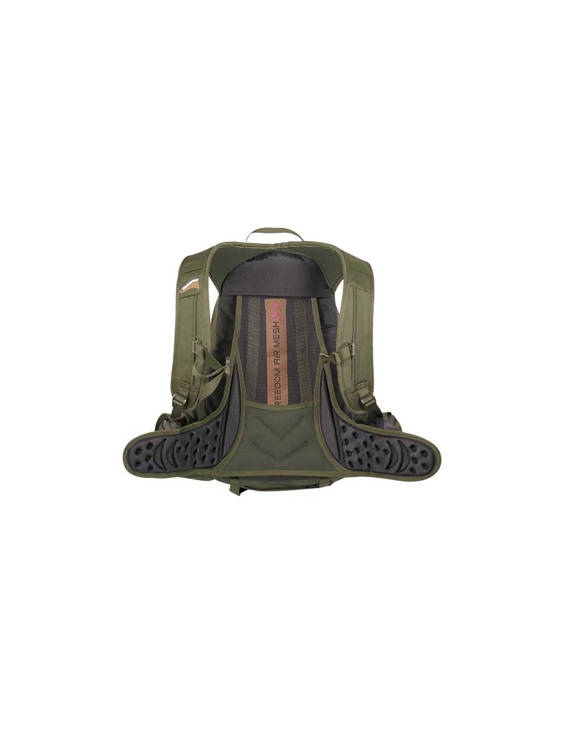 Mochila de caza ergonómica, con sistema FREEDOM AIR MESH en la zona lumbar. Cinturón ergonómico, acolchado y perforado, con correas acolchadas ajustables para los hombros y correa deslizante para el pecho con silbato de emergencia. Amplios bolsillos frontales para accesorios con numerosos compartimentos. Equipada con funda extraíble para rifle situada en la parte inferior y correas de retención. Compatible con sistema/bolsa de hidratación y funda protectora impermeable para lluvia extraíble en la base de la mochila.