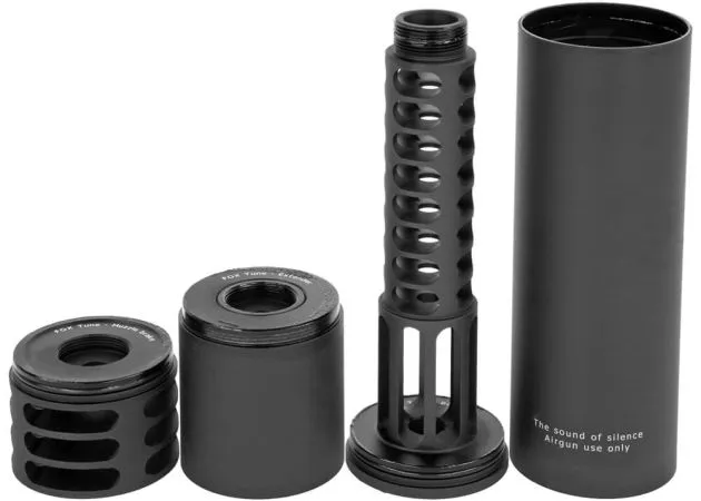 Este moderador FOX Silencer Tune está diseñado específicamente para rifles de aire comprimido PCP muy potentes. Los moderadores de este tipo de pistolas de aire comprimido tienen un diseño diferente al de los moderadores de las pistolas de aire comprimido normales. Consta de varios componentes; La base es el núcleo del silenciador perforado con cubierta. La parte delantera cuenta con una tapa final especialmente diseñada. Al aflojar esta tapa, la cubierta se puede girar para que el logotipo se alinee perfectamente.
