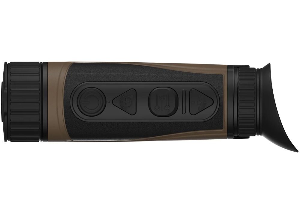 El monocular de imagen térmica DNT Hound H325R cuenta con una carcasa ergonómica, lo que lo hace cómodo de sostener, incluso durante largas sesiones de caza u observación. Esto se aplica tanto al uso de zurdos como diestros. Los botones táctiles claramente en la parte superior del Hound H325R aseguran un funcionamiento muy intuitivo, permitiendo que la otra mano permanezca libre.