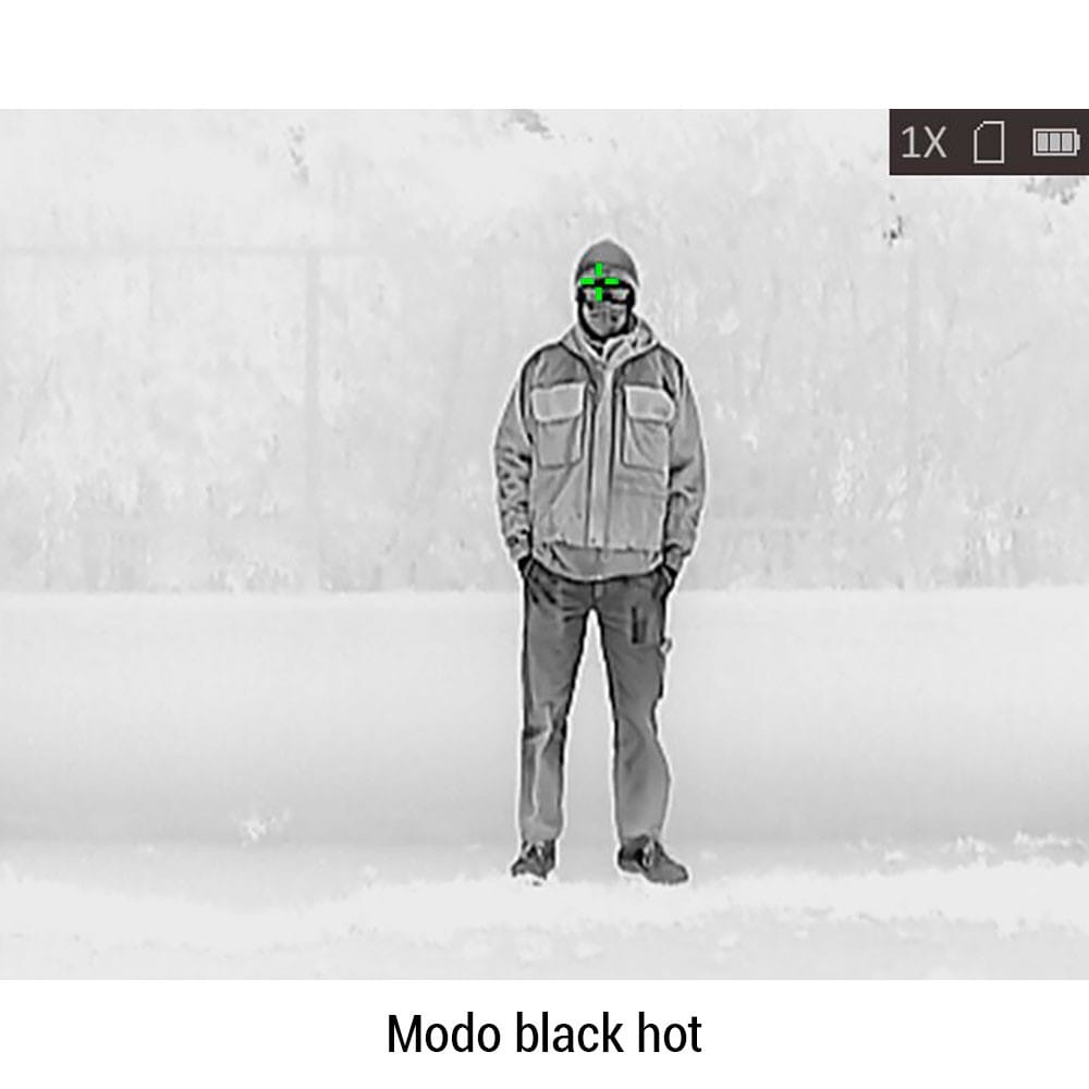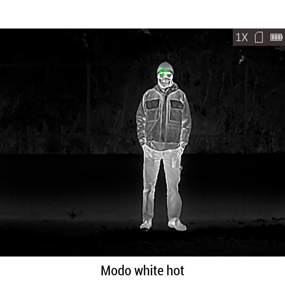 - 4 modos de visualización: fusión (Imagen infrarroja), red hot (imagen en blanco y negro con zonas cálidas resaltadas en rojo), white hot (imagen en blanco y negro con zonas cálidas resaltadas en blanco), black hot (imagen en blanco y negro con zonas cálidas resaltadas en negro)