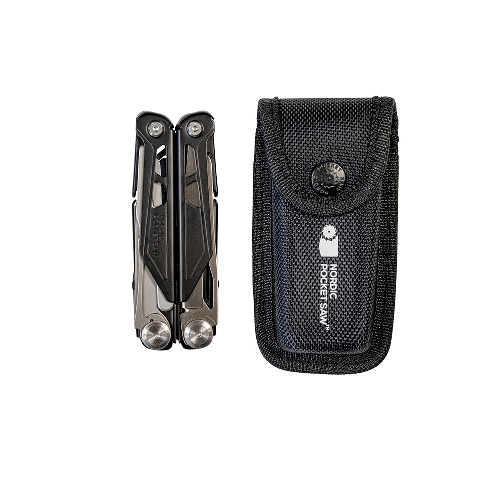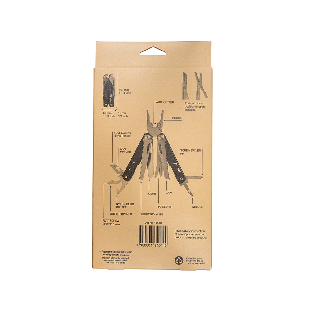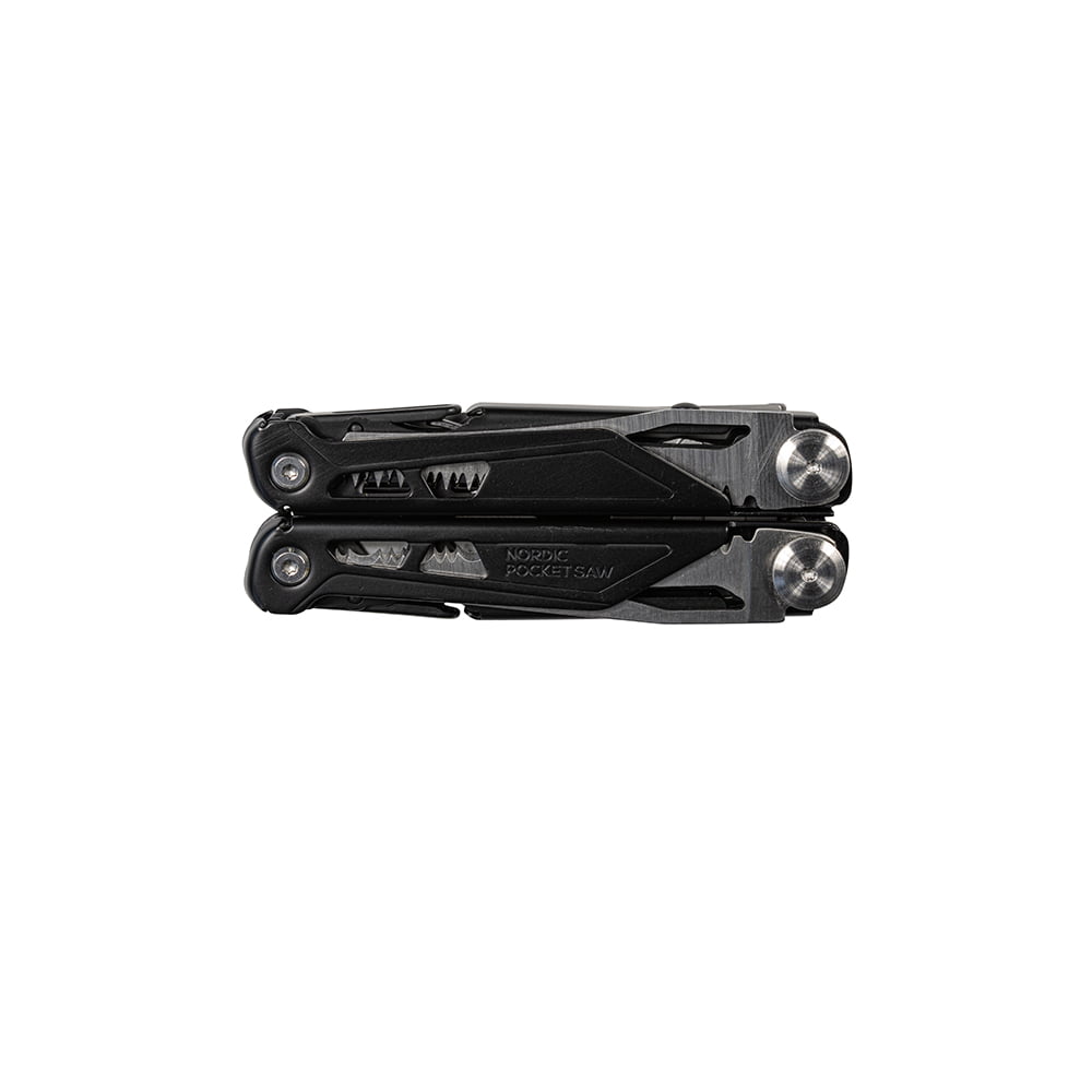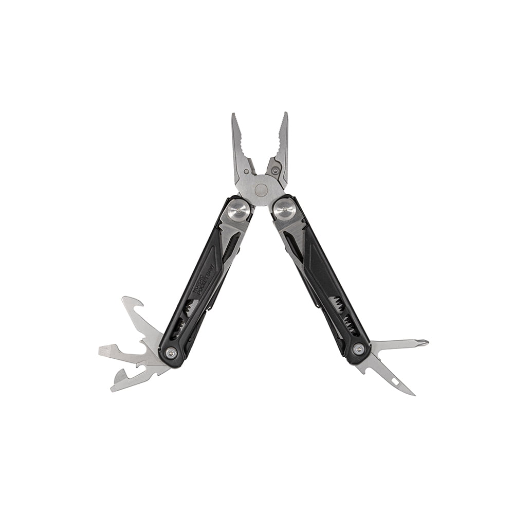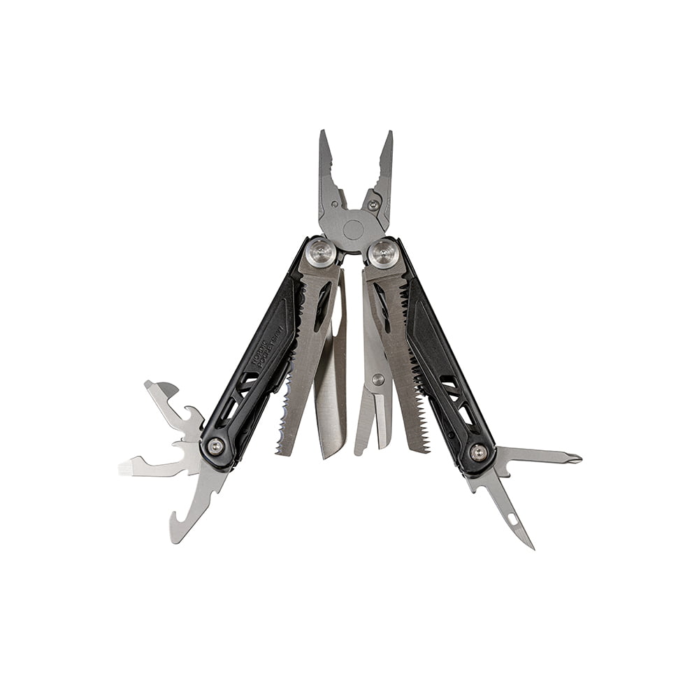 La multiherramienta cuenta con un cuchillo con hoja de pata de oveja, que es adecuado para cortes limpios en superficies planas, y un cuchillo dentado para cortar cuerdas y cuerdas de nylon. Además, incluye dos destornilladores planos (3 mm y 5 mm de ancho), un destornillador PH1, un abrelatas, un abrebotellas, unos alicates con función cortaalambres, unas tijeras y el cortacordones. La hoja de sierra ha sido equipada con dientes extra afilados y largos para cortar madera fresca y seca. El mecanismo de bloqueo de todas las herramientas, excepto los alicates, proporciona mayor seguridad durante el uso.