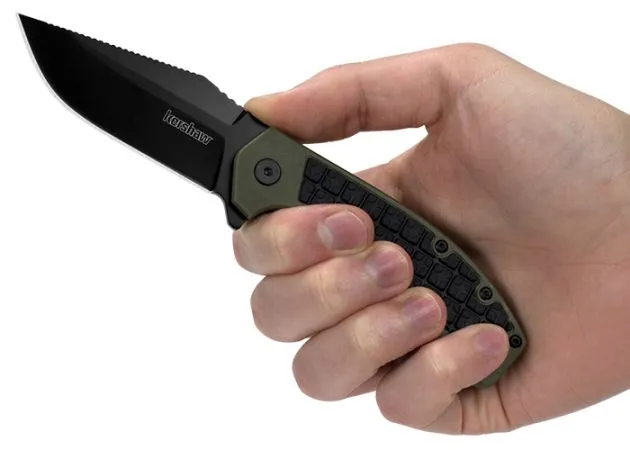 Gracias a la aleta, la falla de Kershaw se puede abrir con una sola mano. Este movimiento es rápido y suave, gracias al sistema de rodamientos de bolas KVT. Debido a que las básculas están hechas de nailon reforzado con fibra de vidrio resistente al desgaste, se utiliza un bloqueo de forro insertado para asegurar la hoja cuando se abre. El espaciador trasero está hecho de caucho y las escalas están recubiertas de goma para un excelente agarre.