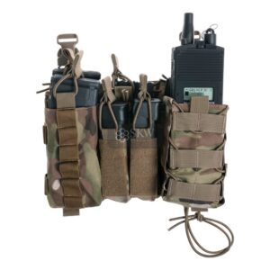 Panel frontal preconfigurado de Delta Tactics con clips machos con pouches de extracción rápida tipo para 3 cargadores de tipo AR, G36, AK… Cartuchos de escopeta, 2 pouches de cargadores de pistola, pouch para radio o distintos accesorios.