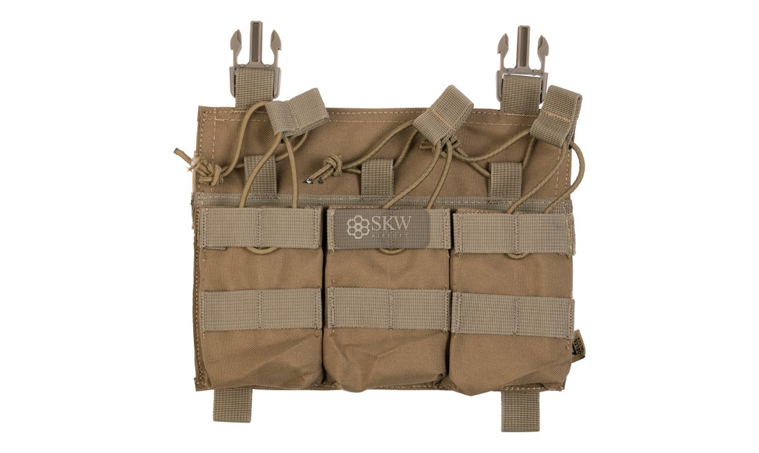 Panel frontal preconfigurado de Delta Tactics con clips machos con 3 pouches de extracción rápida con una goma de sujeción en la parte superior para 3 cargadores de tipo AR, G36, AK…